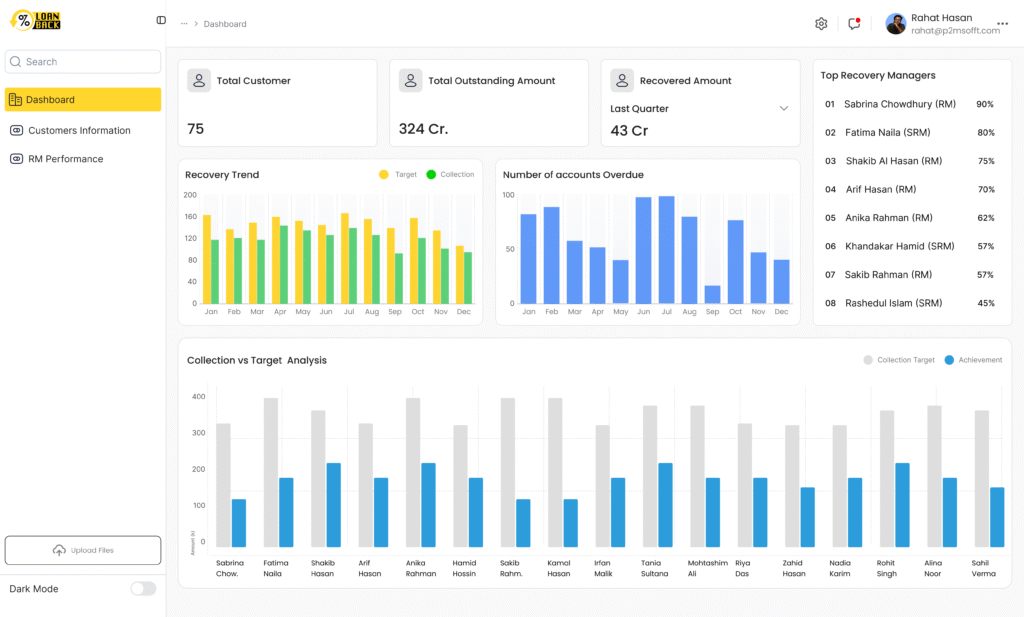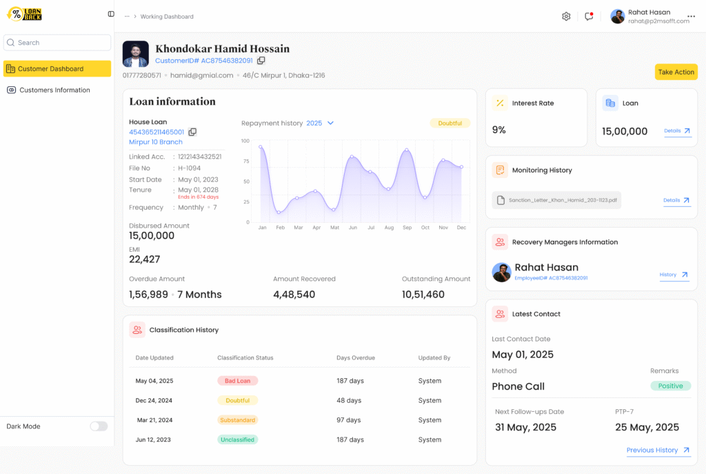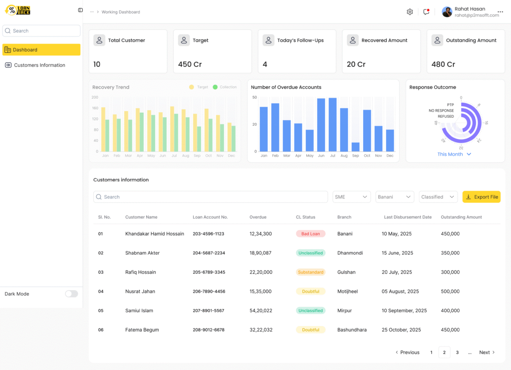 Centralized & user wise dashboard for continuous monitoring of Loan for Retail, SME & Corporate, real-time overdue tracking on the go, DPD, repayment ranking and many more
