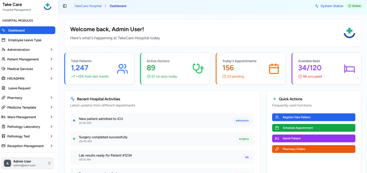 Take Care automates hospital operations with intelligent dashboards, real-time patient monitoring, and modular ERP design. Manage patients, staff, billing, store, pharmacy, pathology, OPD, IPD & others — all in one unified platform. There are 19 modules in this system till now.
